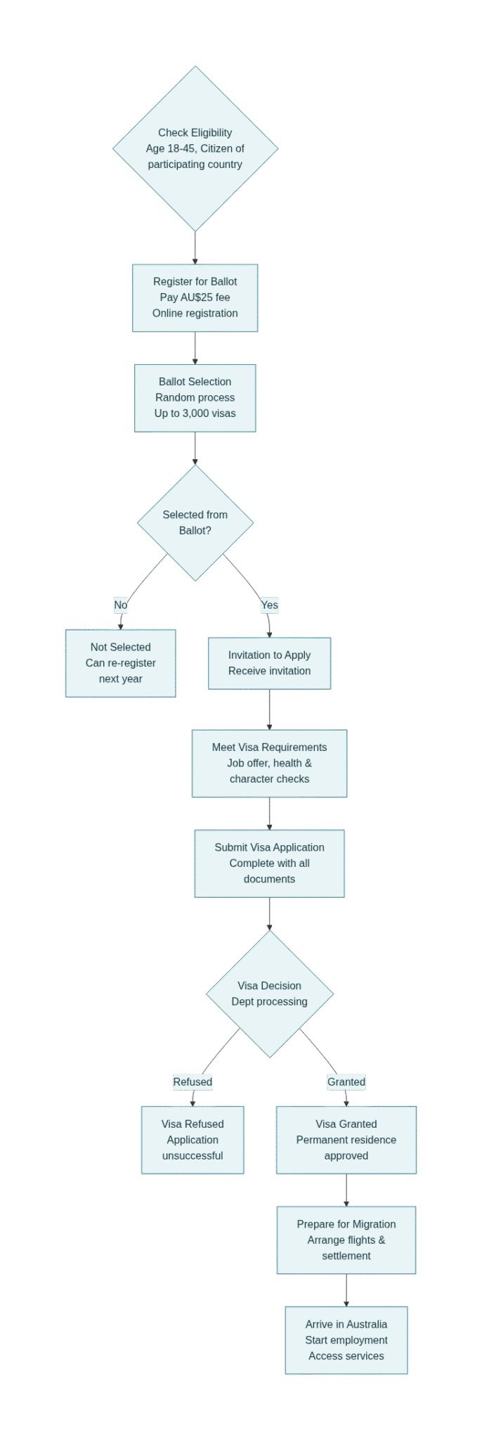 Selection | Random ballot per eligible country. Invitation is required before you can lodge a visa application. Immigration and citizenship Website |