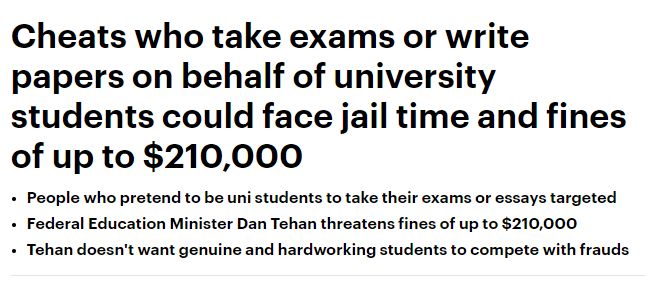 现任联邦教育部长Dan Tehan表示目前针对代考和代写的惩罚措施还不够好;同时他也表示代写和代考对于勤奋努力学习的学生来讲也是不公平的,勤奋的学生不应该与“诈骗者和欺诈者”竞争。