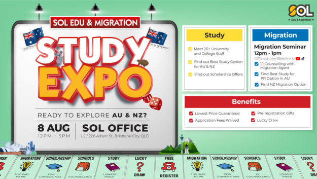 为什么要参加思安教育展? 在澳大利亚和新西兰开启你的留学梦想!抓住这个免费的机会,与来自澳大利亚和新西兰著名大学、职业培训学院和英语学校的代表进行1对1交流。我们的注册移民代理团队在这里帮助您找到最佳的移民途径。 1对1咨询 和校方代表 免费1对1 移民定制化咨询 最新移民政策 更新讲解 奖学金 & 免申请费 1对一咨询 和校方代表 最新移民政策 更新讲解 免费1对1 移民定制化咨询 奖学金 & 免申请费 活动内容 12:00PM-1:00PM 移民讲座 我们经验丰富的注册移民代理将为您介绍2023/2024财政年度的技术移民选择,技术移民打分制和州担保提名更新,以及最近的澳大利亚移民政策改革。 1:00PM-5:00PM 1对1学校咨询 直接与学校代表咨询,并获得量身定制的最佳建议,现场知道哪些项目和学校最适合你。今天就迈出实现澳大利亚梦想的第一步! Online线上咨询也可以哦! 1:00PM-5:00PM 游戏娱乐站 & 幸运大抽奖 在我们的游戏娱乐站玩小游戏,赚取积分和赢得大奖!通过参加学校咨询会议和与我们经验丰富的顾问聊天来提高你的分数。不要错过这个赢取大奖的机会! 12:00PM-1:00PM 移民讲座 我们经验丰富的注册移民代理将提供2024年签证政策更新的深入概述,包括费用变化,获得澳大利亚和新西兰永久居留权(PR)的途径,以及基本的移民问答。随时了解最新的见解和更新技术移民选项,技术移民打分制度,以及新财政年度2024/2025的州担保提名标准。 1:00PM-5:00PM 1对1学校咨询 与学校代表进行直接对话,并获得量身定制的建议,现场知道哪些项目和学校最适合你。今天就迈出实现澳大利亚和新西兰梦想的第一步吧!线上咨询也可以哦! 1:00PM-5:00PM 游戏娱乐站& 幸运大抽奖 在我们的游戏娱乐站玩小游戏,赚取积分和赢得大奖!通过参加学校咨询会议和与我们经验丰富的顾问聊天来提高你的分数。不要错过这个赢取大奖的机会! 参展澳洲大学 参展职业学校&语言学校 参展新西兰大学 有机会现场赢取 幸运大奖与报名礼品* *T/C apply 报名通道已开启