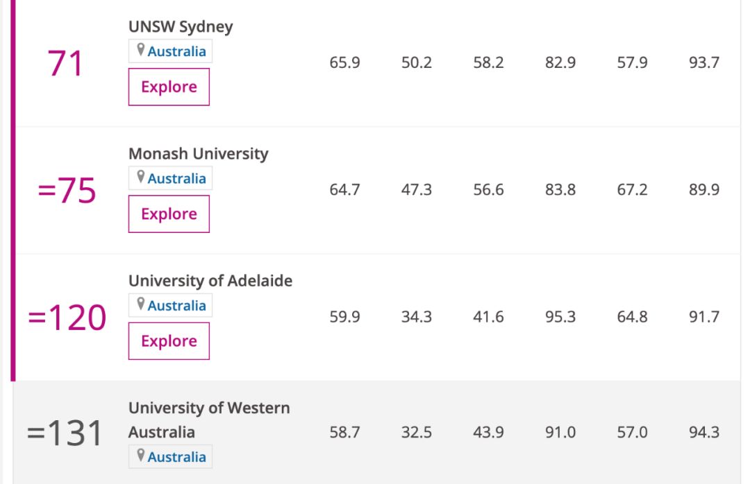 澳洲大学第九席位确定?!最新泰晤士高校排名出炉。最新的泰晤士世界大学排名出炉,澳洲八大有六所跻身全球前100,最强黑马居然是我们的“蓝朋友”?扫码添加客服了解更多澳洲大学第九席位确定?!最新泰晤士高校排名出炉。 今天凌晨,泰晤士2020世界大学排名,悄咪咪的就这么发布了。作为三大高校排名榜,今年的泰晤士排名涵盖了来自92个国家的1400余所高校。本排名将从教学水平、科研能力、引用数目、国际视野以及产业收入五个方面13个项目来评分。其中以墨尔本大学为首,澳洲国立大学、悉尼大学、昆士兰大学、新南威尔士大学、莫那什大学成功跻身全球前100优秀大学的行列。阿德莱德大学和西澳大学紧随其后。 本次排名中,澳洲占前200名仅有11所大学。那么除了八大,还有哪三所大学成功入围呢? No.194 稳步前行-UTS 悉尼科技大学比往年提高了2位,拿到194名的位置,在全澳排至第11名。从2015年开始直至去年,UTS一直位列于全澳年轻大学的榜首之位,是很多新兴产业、新型专业的摇篮。No.193 “偏远地区”的UC 位于“偏远地区”首都的堪培拉大学本次不动声响的跻身澳洲TOP10高校行列。在泰晤士2020全球排名中获得了第193名的席位。同样作为澳洲的年轻大学,堪培拉大学一向以高就业率、移民利好为许多国际学生的首选。 No.179 黑马中的战斗机-QUT 我们的“蓝朋友”QUT,绝对是本次排名的黑马。从前几年一直稳居201-250赛段的位置,今年突围至179的好名次,即八大之后,澳洲第9位,昆士兰第2位跻身世界200强的高校。作为一个澳洲的年轻大学的代表,这些年,QUT不论是从硬件上-创新产业学院园区的落成,教育学院新概念大楼的建设等等,到教学质量、科研能力上,均有不少的提高。 莫纳什大学及悉尼科技大学介绍及专业推介 布里斯班city炸鸡哪家强,今日给你安利这个超赞韩式炸鸡店! 预计还有不到十年,职业类型将进入下一个“信息时代”?!新的“铁”饭碗工作将会是如何? 不想参加高考?高考成绩不理想?高二,高三生如何进入世界排名第38,澳洲排名第3的悉尼大学,干货都在这里,快收藏起来看看 ! 喜大普奔!澳洲PR/Citizen的父母也可以直接入境了! 6月16日起,美国禁止中国客运航班!疫情、歧视、游行、特别对待?美国和澳洲在细微上的不同?