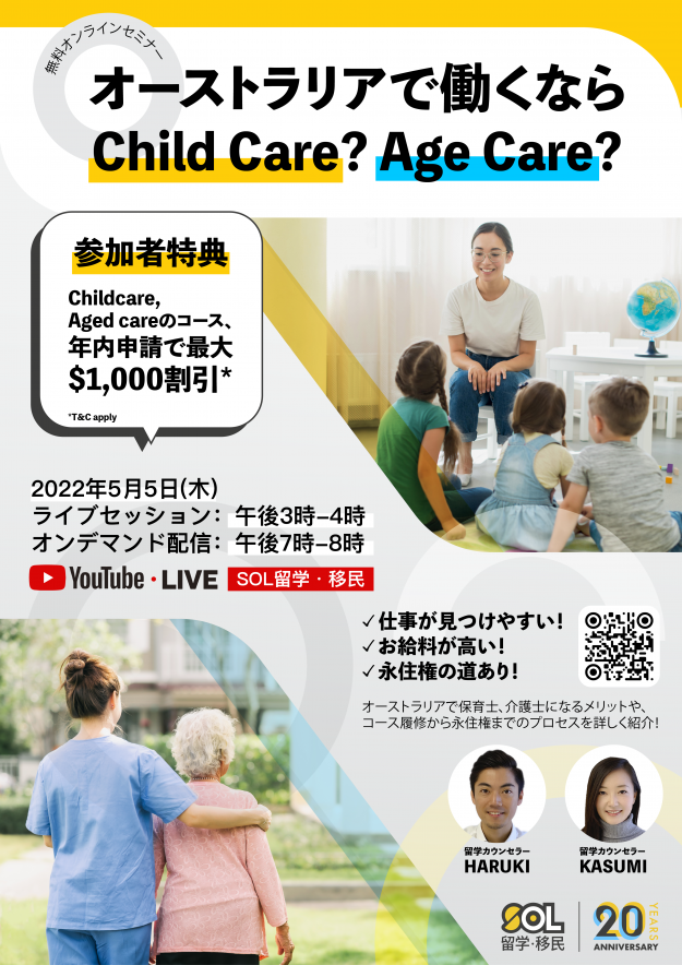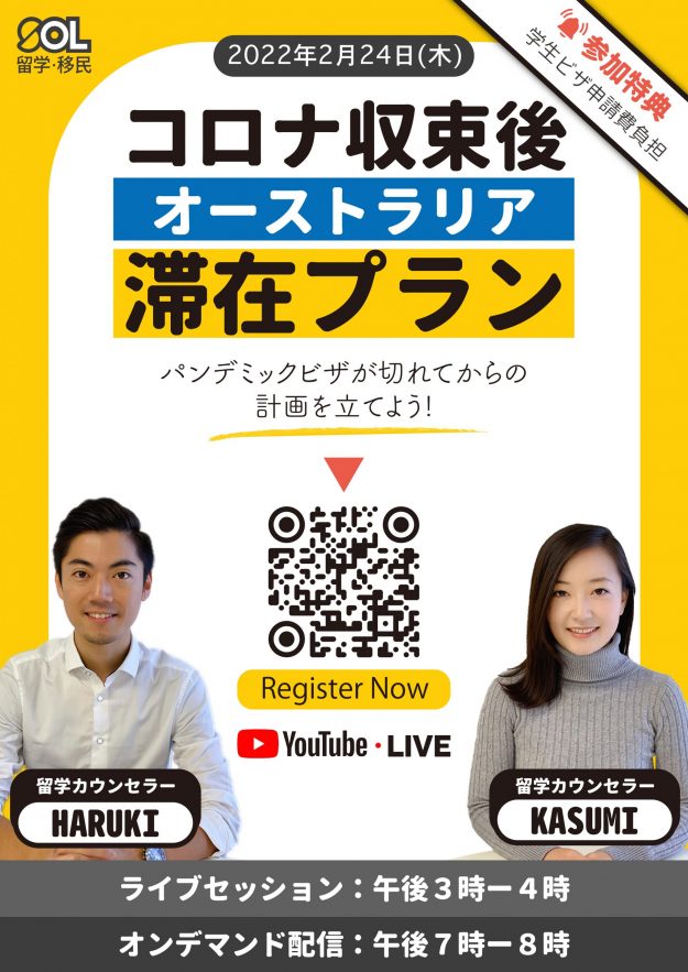 みなさん、こんにちは。SOL留学です。 SOL留学の最大イベント、STUDY EXPOの開催が近づいてきました🎉 オーストラリア国内計20以上の教育機関が参加する国内最大規模の留学エクスポイベント。各学校のスタッフと直接カウンセリングを行い、ご自身に最適な学部や学習プランを選択することができます。 今年20周年を記念するSOL留学、例年より更に多くの特典が用意されています🔥 今回はStudy Expoの魅力とイベントに参加する学校をご紹介! STUDY EXPOとは? STUDY EXPOは、約20以上の大学、TAFE、専門学校、語学学校を含む多くの教育機関が参加するイベントとなっています。イベント内では学校のスタッフと直接話すことができ、気になるコース、学費、奨学金などの情報を聞くことが出来ます。 イベントはオンライン、オフライン(対面)両方で開催されるため、日本国内の方でも参加可能となっています。 また、冒頭でも記載された通りSOL留学は今年で20周年を迎えます㊗️これに伴い、例年より豪華な特典が用意されています。 20周年を記念して、最大$2,000の奨学金がもらえるルーレットゲーム 参加者の方にはStarbucksの$5デジタルギフト券 $20分のビザサービス割引券 iPad, Jetstarギフト券, Movie World等テーマパークの年間パスが当選する大抽選会 また、参加校からの特典にも大注目です! 盛り沢山の奨学金 STUDY EXPO限定のプロモーション 学校申請費無料 イベント当日には無料ビザカウンセリングも可能ですので、こちらをご希望の方も是非お申し込みください! 毎年多くの方に参加いただくSTUDY EXPO、今回も多くの参加者が予想されていますので参加希望の方はお早めに事前登録をお済ませください。 *イベントは英語でのカウンセリングとなりますが、語学に自信がない方にはSOL留学のカウンセラーがサポート致します。 今すぐお申し込み大学 アデレード大学 (The University of Adelaide) 注目の大学 この学校を選ぶ理由 Group of 8にノミネートされている大学!また、南オーストラリア州の大学ランキング1位にランクイン。 柔軟な入学条件や地方認定地域のキャンパスである事も魅力の一つです。 STUDY EXPO、スペシャルプロモーション University of Adelaide College International Scholarship こちらはAdelaide College 卒業後…