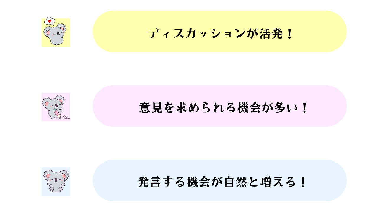 そのため、ディスカッションが活発意見を求められる機会が多い発言する機会が自然と増えるという環境で、しっかりアウトプットできました。