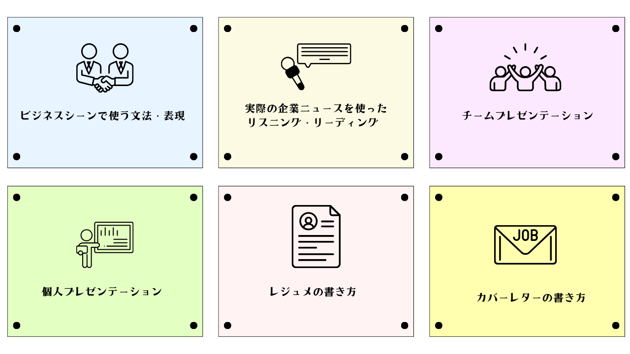 自分の経歴これまでの経験強みやスキルをクラスメイトの前でプレゼンテーションしました。英語版の自己PRのような内容で、実際の就職活動にも役立つと感じました。
