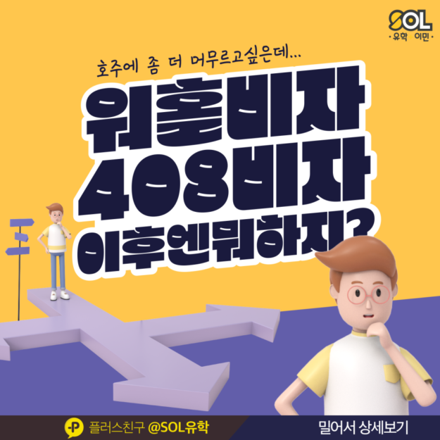 호주 코비드 비자 408비자 폐지 발표. 이후 호주 체류 가능한 옵션은? 호주 세컨비자, 호주 써드비자, 호주 장기비자 고민이라면 SOL유학이민과 함께하세요.