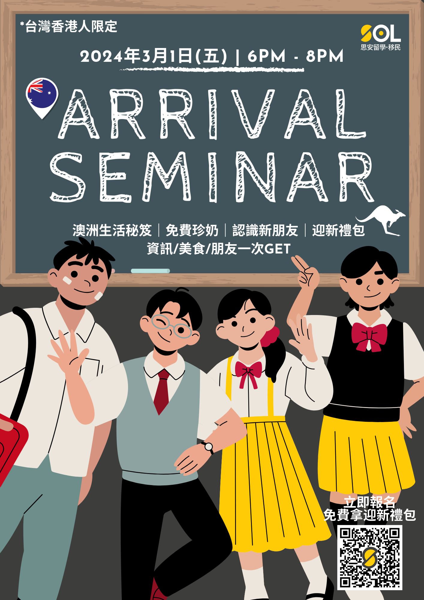 Last Updated on 13/02/2024 台港迎新晚會!帶你瞭解澳洲須知,還能認識新朋友! 活動詳情 活動:台港迎新晚會! 日期:2024年03月01日 (星期五) 時間:18:00 – 20:00 地點:思安辦公室 (Level 2/226 Albert St, Brisbane City QLD) 價錢:免費,現場提供免費珍奶 活動內容 教你如何解決各式澳洲大小事(銀行、手機辦理等…) 澳洲新手禮包免費領 免費珍珠奶茶 認識新朋友 ‼️台港留學生、打工度假簽證者限定‼️